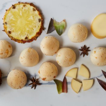 Queijos (minas artesanal, parmesão e provolone), polvilho doce, água, abacaxi, polvilho azedo, ovo integral pasteurizado, açúcar, óleo vegetal, leite em pó, margarina, amido de mandioca modificado, sal light, açúcar mascavo e goma xantana.