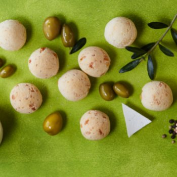 Queijos (ricota, minas artesanal e parmesão), água, azeitona, polvilho doce, polvilho azedo, ovo integral pasteurizado, óleo vegetal, amido de mandioca modificado, margarina, leite em pó, sal light e azeite de oliva.